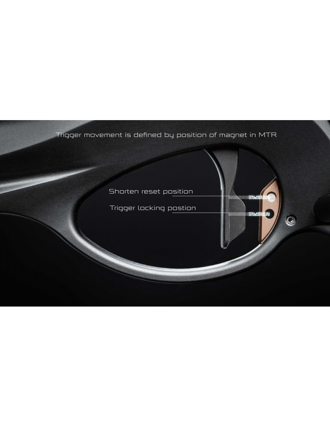 l'Elysien Créapeiron est unique dans son remarquable régulateur de détente magnétique (MTR): un petit aimant, placé à l'intérieur de la butée de la gâchette à l'intérieur de la gâchette, peut être réglé manuellement dans deux positions différentes pour personnaliser la course de déclenchement.